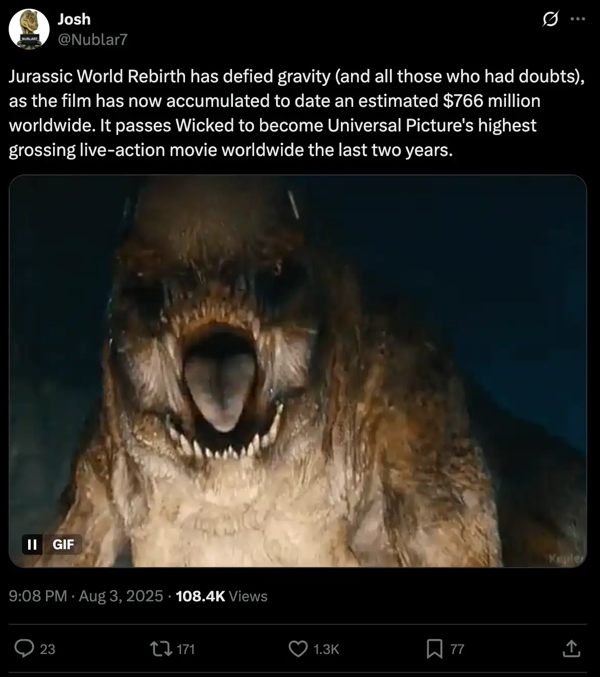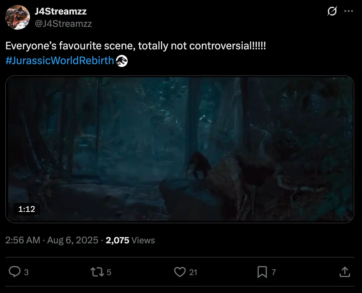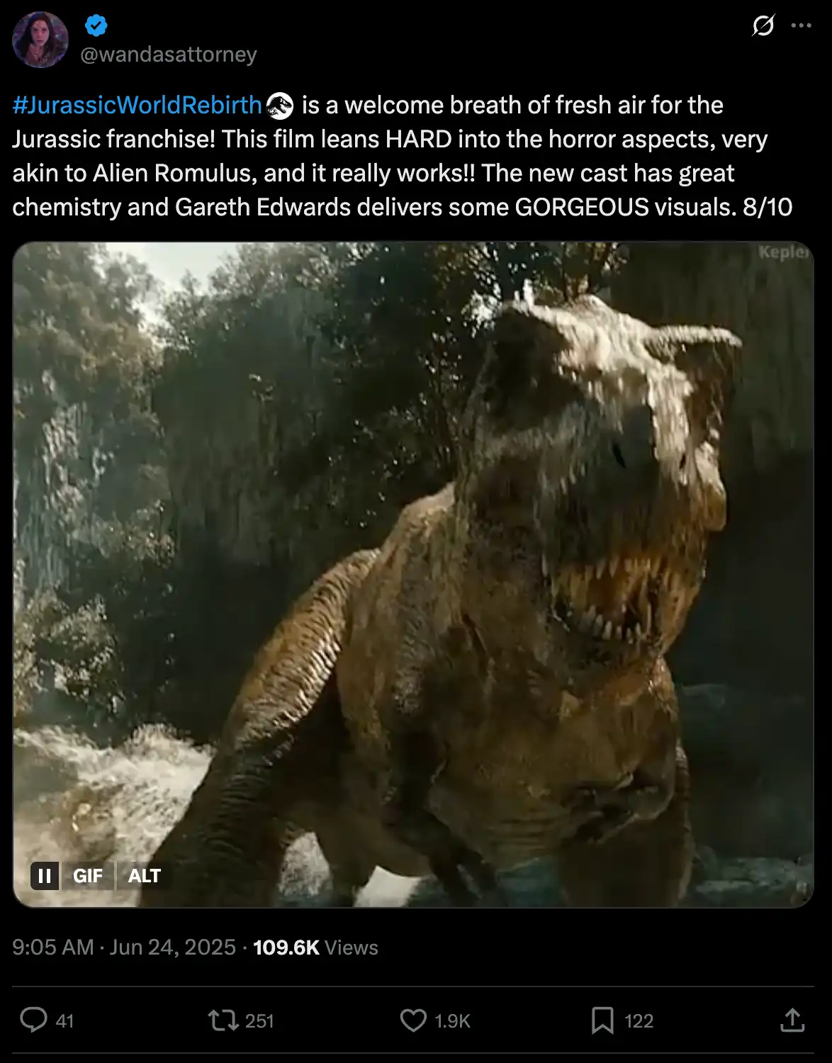 "Yesterday I have seen Jurassic World: Rebirth. It’s best Jurassic World film by far and looks amazing by being shot on 35mm film. Colors are amazing and the CGI blends very naturally. Love the new cast. Also very glad that the dino’s act like animals instead of monsters."