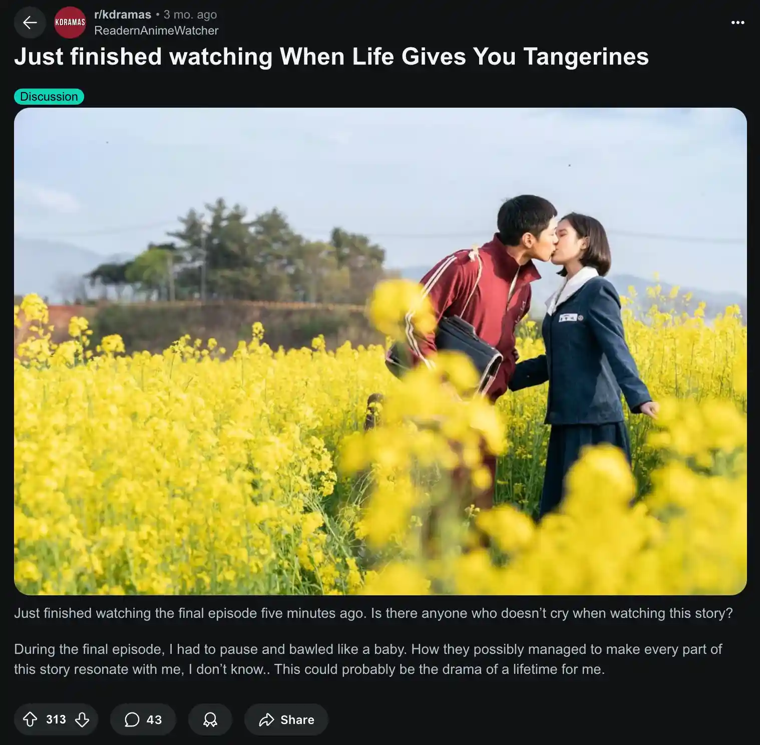 This isn't just another romantic comedy or a typical coming-of-age story. "When Life Gives You Tangerines" has managed to carve out its own special place, resonating deeply with viewers across different cultures and age groups.